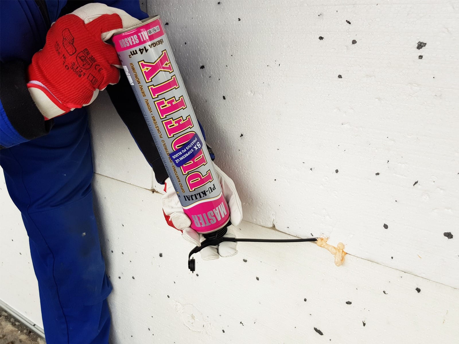 - Izoliacinių plokščių tvirtinimas prie fasadų ir pamatų.